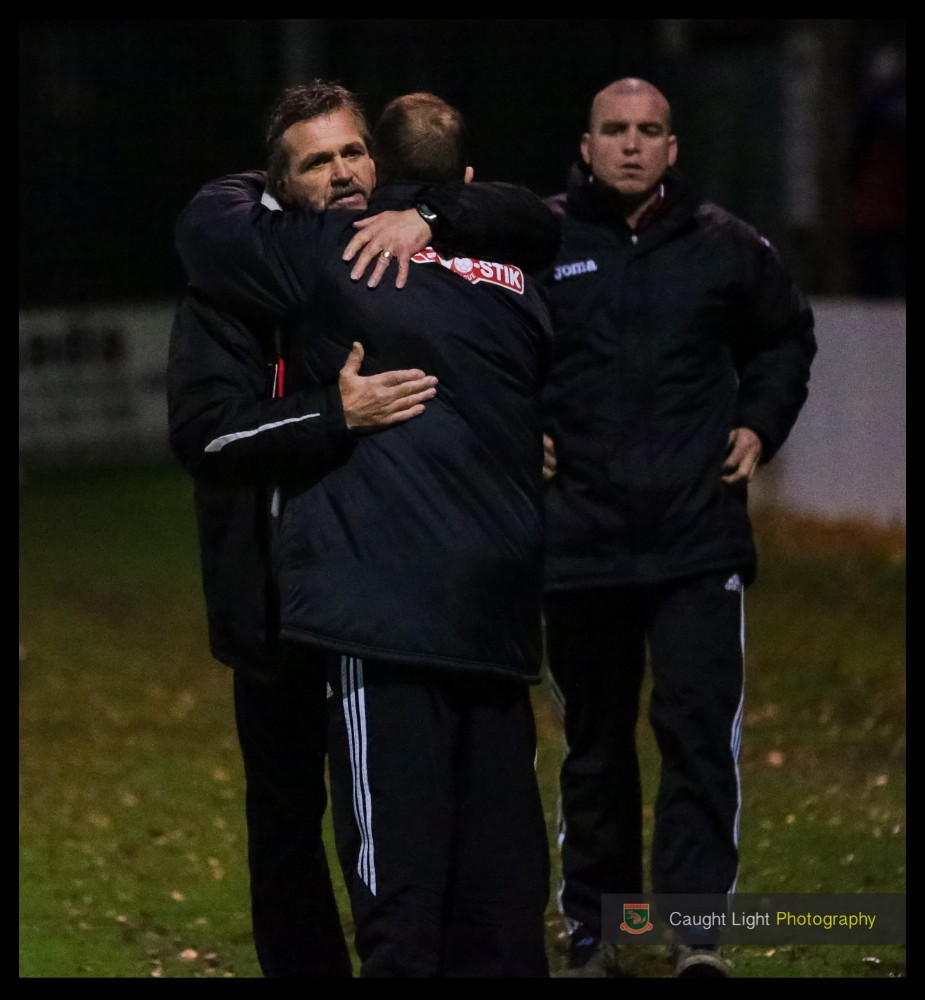 Final act: Rudy Funk hugs Harrogate Railway manager Billy Miller – literally seconds before announcing his resignation as manager of Scarborough. Photo: Caught Light Photography