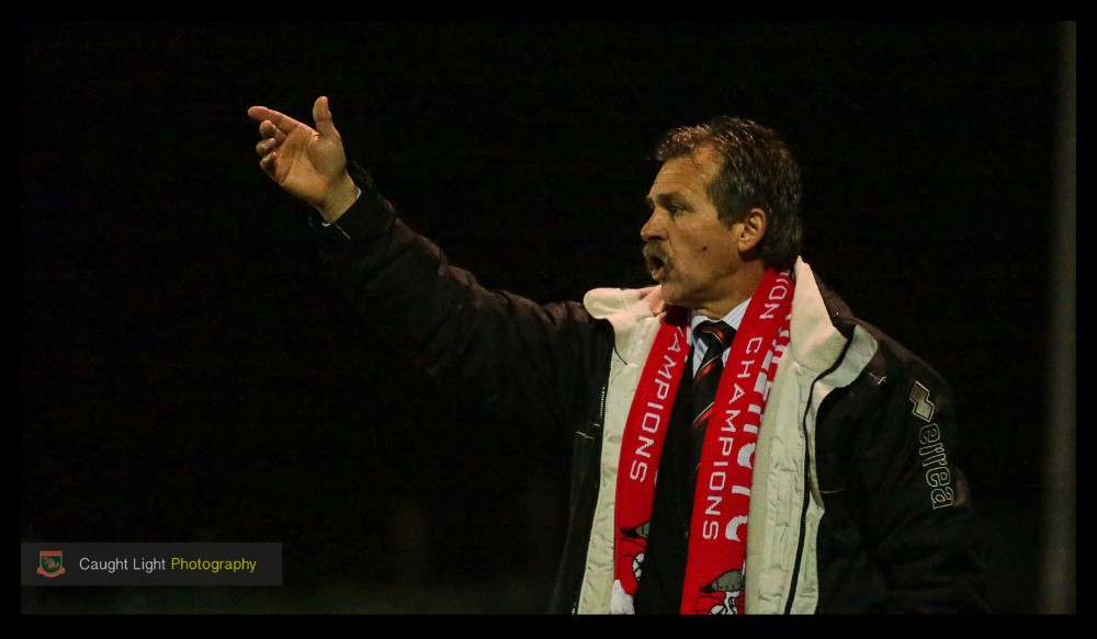 Gone: Rudy Funk cuts a frustrated figure during Scarborough’s 3-0 defeat at Harrogate Railway. Funk resigned after the game. Photo: Caught Light Photography