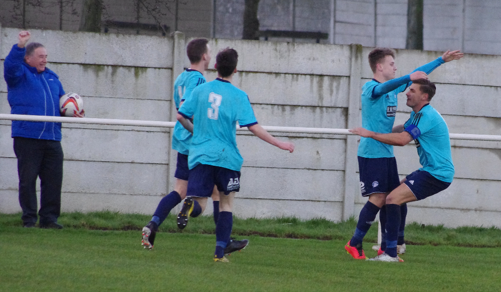 A group of Hemsworth players run to Nick Guest after his cross allowed Robbie Crapper to put the home side ahead