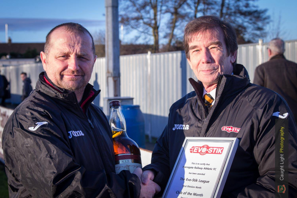 Harrogate boss Billy Miller receives the December club of the month award from Evo Stik representative Neville Wigglesworth. Photo: Caught Light Photography