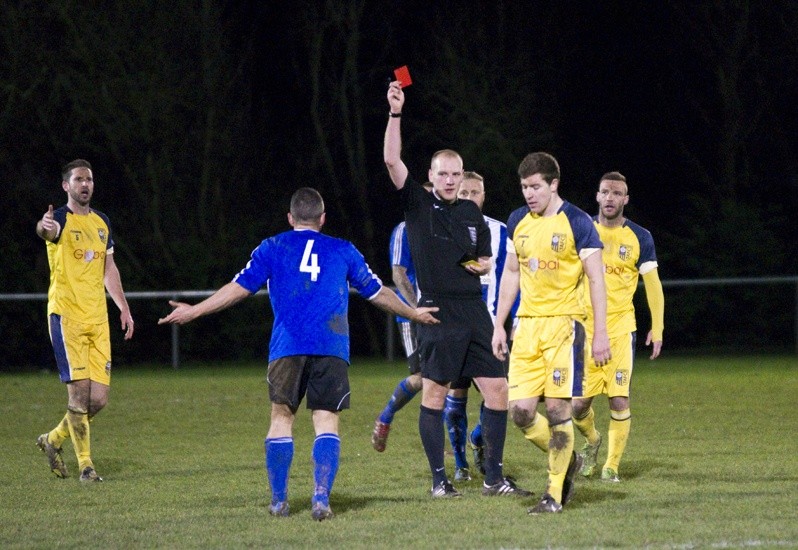 Referee Christopher Akers shows Shaw Lane midfielder Steve Istead his red card in a controversial second half