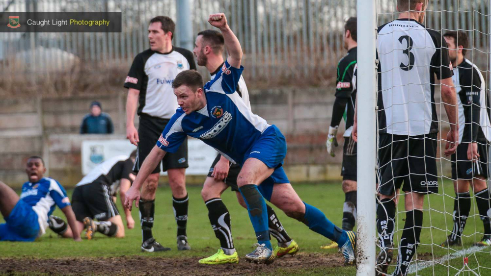 Steve Bromley celebrates scoring the winner for Harrogate Railway at Bamber Bridge. Photo: Caught Light Photography