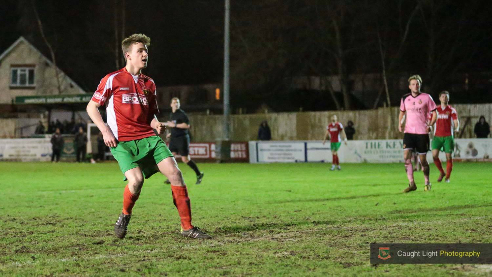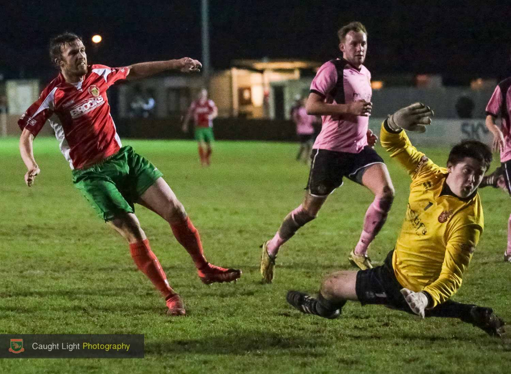 Askham Bryan College student Dan Hickey scores his first goal for Harrogate Railway. Photo: Caught Light Photography