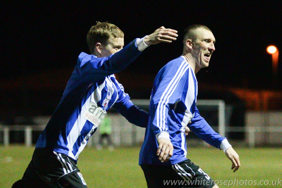 Shane Kelsey (left) congratulates Joe Thornton after he scored Shaw Lane’s second goal. Photo: White Rose Photos
