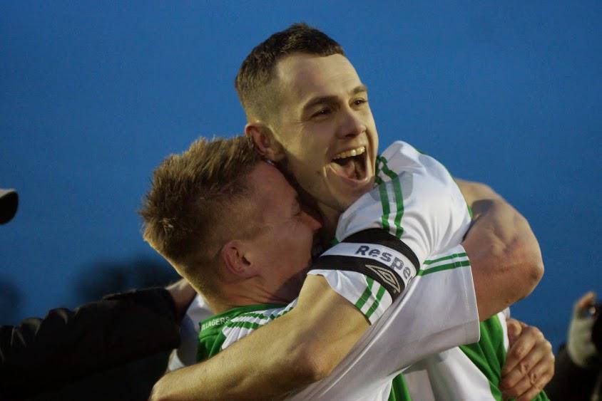 North Ferriby captain Liam King celebrates with Nathan Jarman after they booked their trip to Wembley. Photo: David Gill
