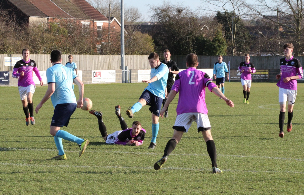 Brad Ricketts’ superb strike puts Barton Town Old Boys in front against Garforth Town. Picture: Steve Hope