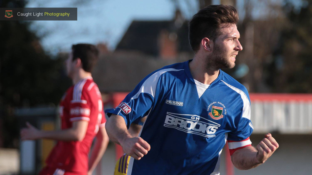 Former Ossett Town player, now Harrogate’s captain, Jason Mycoe pulled a goal back for Railway.