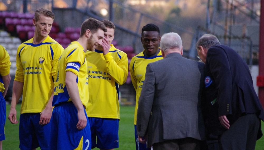 Garforth captain Andy Hawksworth introduces West Riding County FA officials, president Bob Secker and vice-president Eric Beedham to his team-mates and mascots