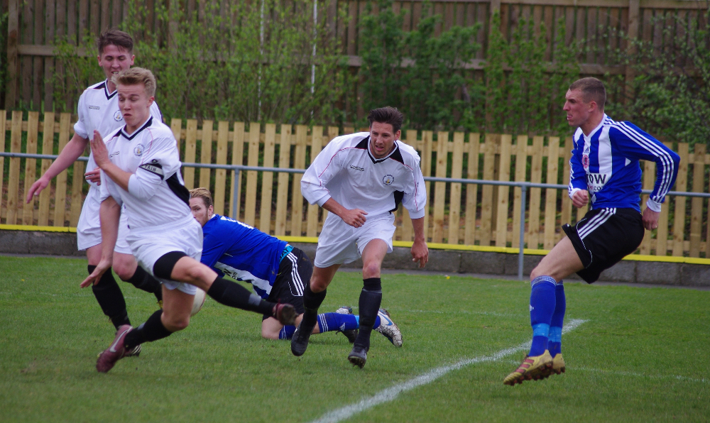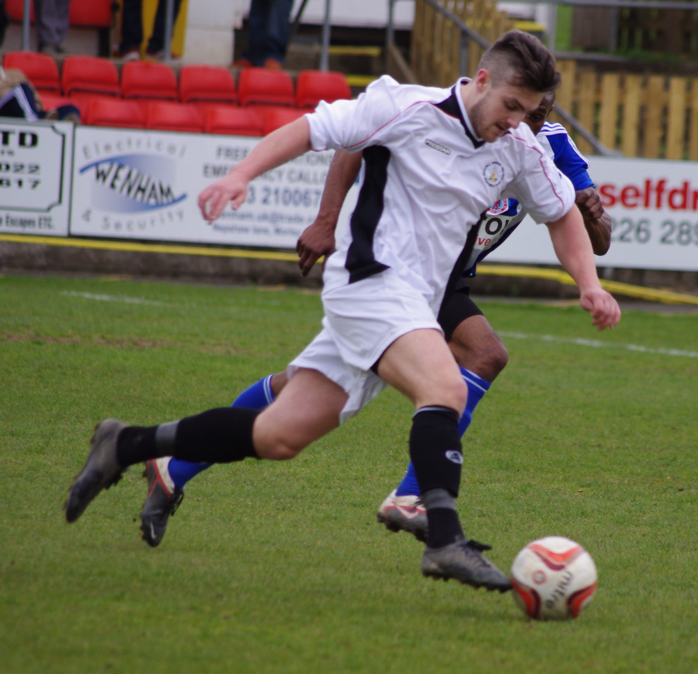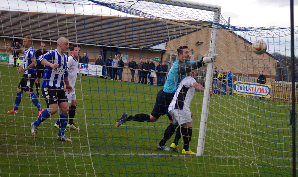 But they did almost immediately. Shaw Lane goalkeeper Ian Deakin kept the visitors at bay initially with a magnificent double save. Deakin, arguably the best stopper in the Premier Division this season, denied James Kitson with a dive to his bottom corner. The ball came loose and Deakin somehow saved Kitson’s rebound attempt at point blank range.