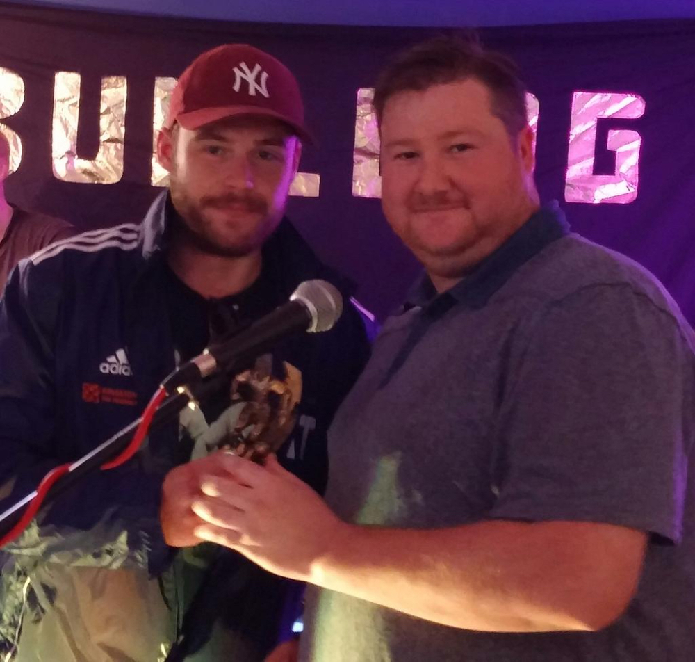 Emmerdale's Danny Miller (left) receives his man of the match award from organiser John Moses
