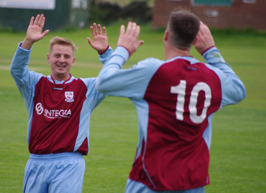 New Penistone striker Steven Kenworthy congratulates Kieron Ryan during one of his final appearances for AFC Emley