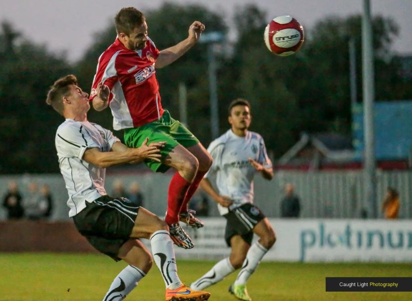 Steve Bromley heads Ryan Sharrocks’ superb cross home in Harrogate Railway’s 2-0 win over Mossley. Picture: Caught Light Photography