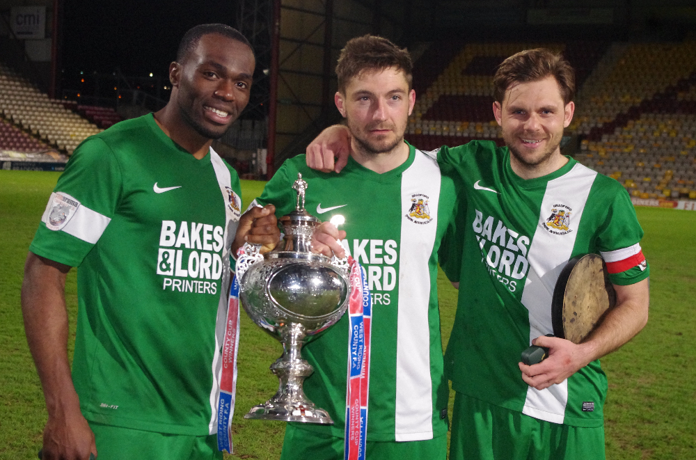 Bradford (Park Avenue) hero Chib Chilaka with Chris Howarth and Jamie Price after their West Riding County Cup triumph in April