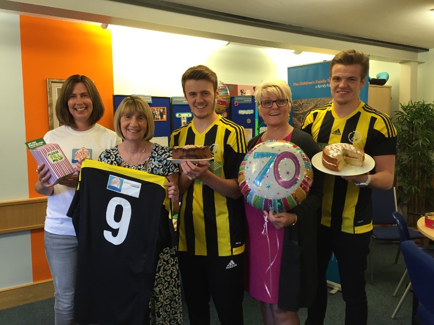 Nostell players Jamie Allsop and Jake Henderson with representatives from new sponsors Lumsden & Carroll Engineering and charity partner The Children’s Family Trust at a MacMillan coffee morning earlier today