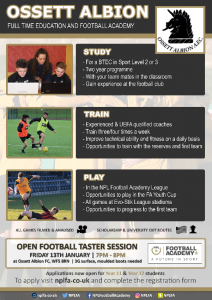 An NPLFA spokesmen added “We are thrilled that Ossett Albion have chosen ourselves to lead and manage their Education and Football Academy from September. After expanding into Nottingham recently, the expansion continues and we are excited to work and build links in Yorkshire.”