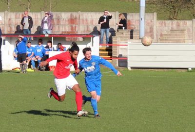 Armthorpe striker Liam Radford in a race with Thackley’s Jerry White. Picture: Steve Pennock