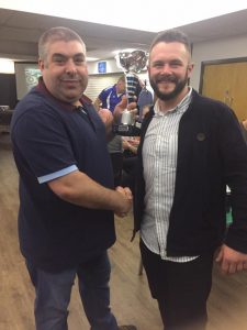 Glasshoughton Welfare chairman Jon Miles presents Ryan Poskitt with one of his two awards