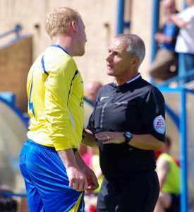 Popular local referee Andy Smith, one of the best around, lectures Ollie Maude