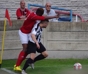 Penistone striker Kieran Ryan holds Jed McGowan