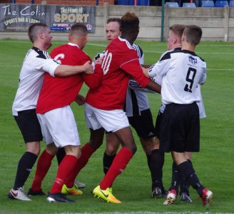 Penistone manager Ian Richards said Parkgate’s Chris Howard should have been shown a second yellow card for his part in this brawl.