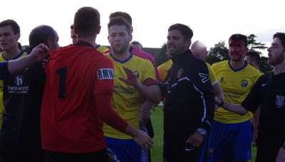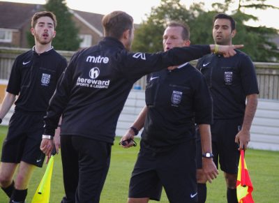 Rainworth manager Craig Denton confronts referee Peter Henger at the end