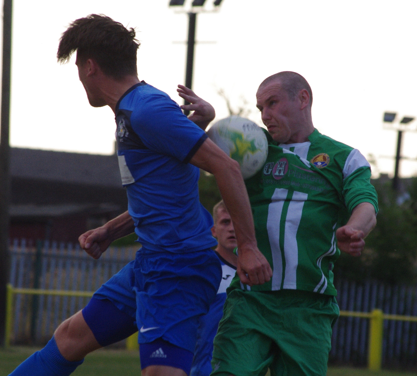 Glasshoughton left-back Matt Cunliffe jumps up for a header