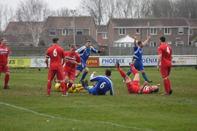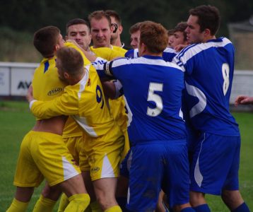 His greatest moment: Sam Belcher and Ash Dexter cheer as Hall Road Rangers match winner James Piercy picks himself up against Grimsby. Picture: Lee Myers